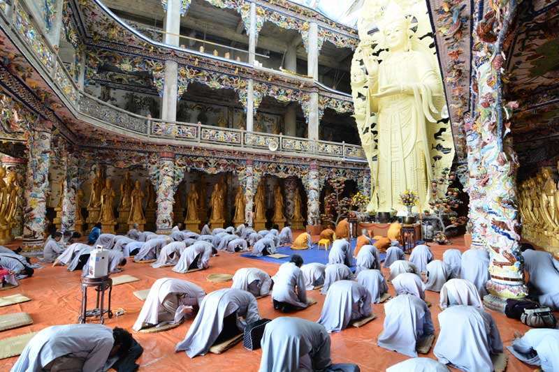 The first works to impress with pilgrims Long Hoa Vien carved dragon 49 meters long curving around the statue of Maitreya Buddha. Fin dragon made of 12,000 bottles of beer next dragon body with fake lakes and islands paint Maitreya Buddha statue atop.