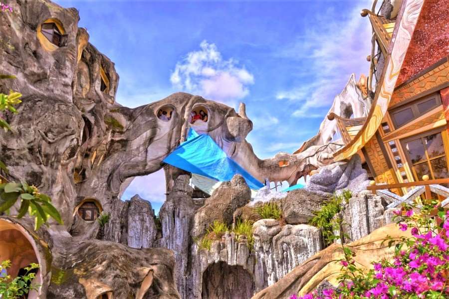 Overview of Crazy House - The House of Freaks The building was built in 1990 as a movement of nature-organic as the works of Antonio Gaudi in Barcelona. However, the interior is very modern. Visitors may feel like visiting Alice's fairytale when looking at the convex windows, strange shapes or garden in the castle with a giant iron spider web at the entrance. villa. The Hang Nga Villa includes the Hook Tree Hotel and the Spider-Man's Castle, which are two ancient tree trunks made of concrete, including the cave rooms named Kangourou, Tiger, Bear, Monkey ... and to reach the "cave", visitors have to go through a staircase around the tree.