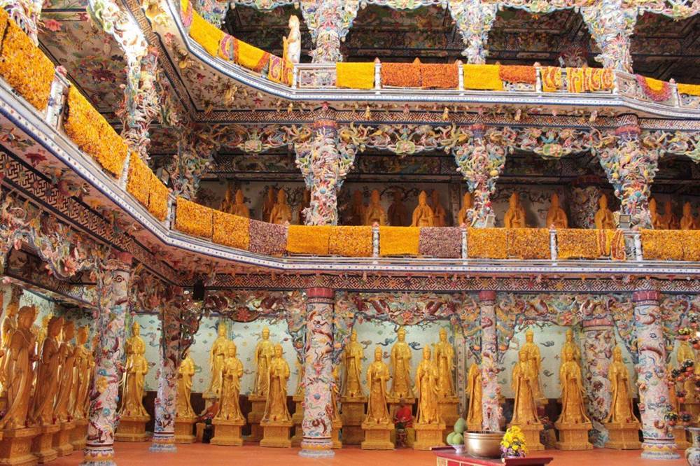 The name "Ve Chai" is not just a playful title; it represents the epitome of creativity and recycling. This pagoda is renowned for using recycled materials to create exquisite artworks. Empty bottles, plastic caps, and other waste materials are ingeniously transformed into Buddha statues, decorative lights, and various artistic pieces, forming a space that is both sacred and close to nature.