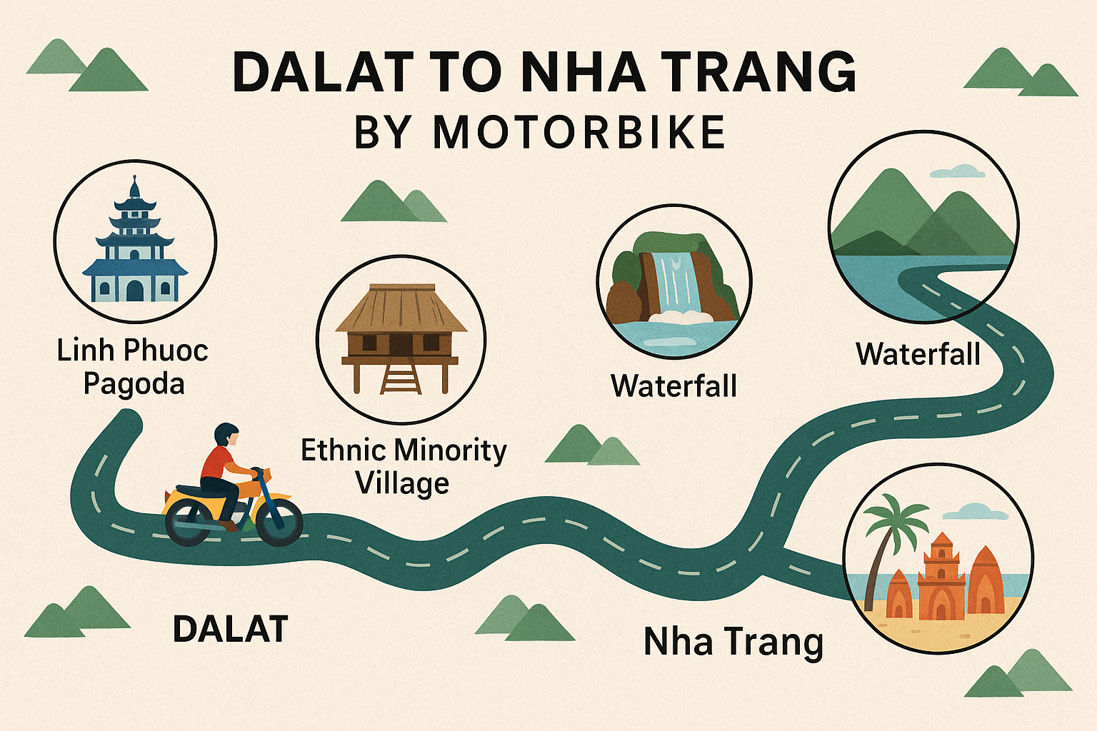 Join an unforgettable Dalat Nha Trang tour by motorbike, a thrilling day ride connecting the romantic highlands of Dalat with the sunny coastal city of Nha Trang.