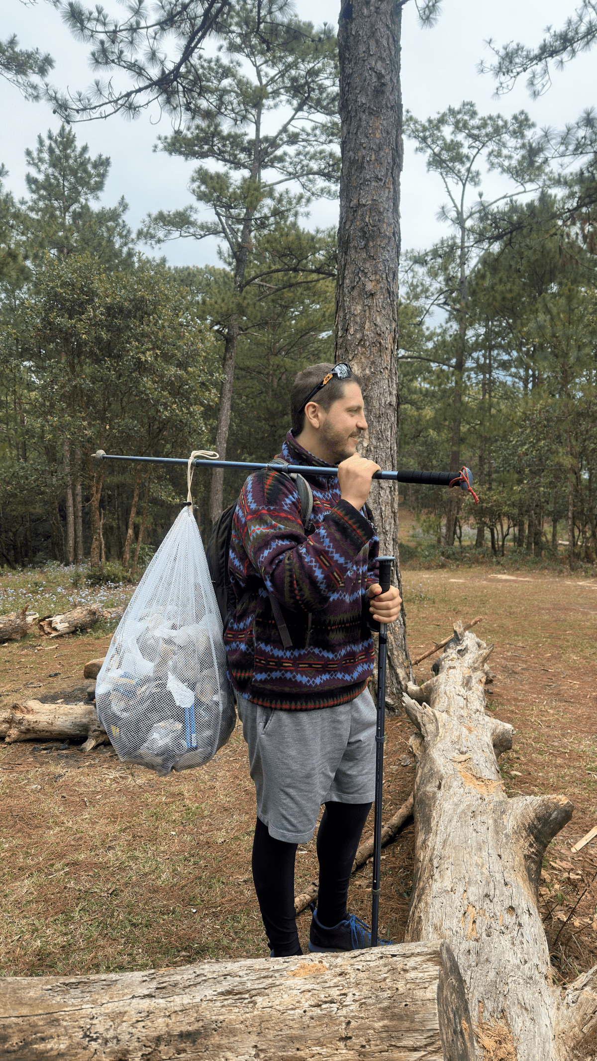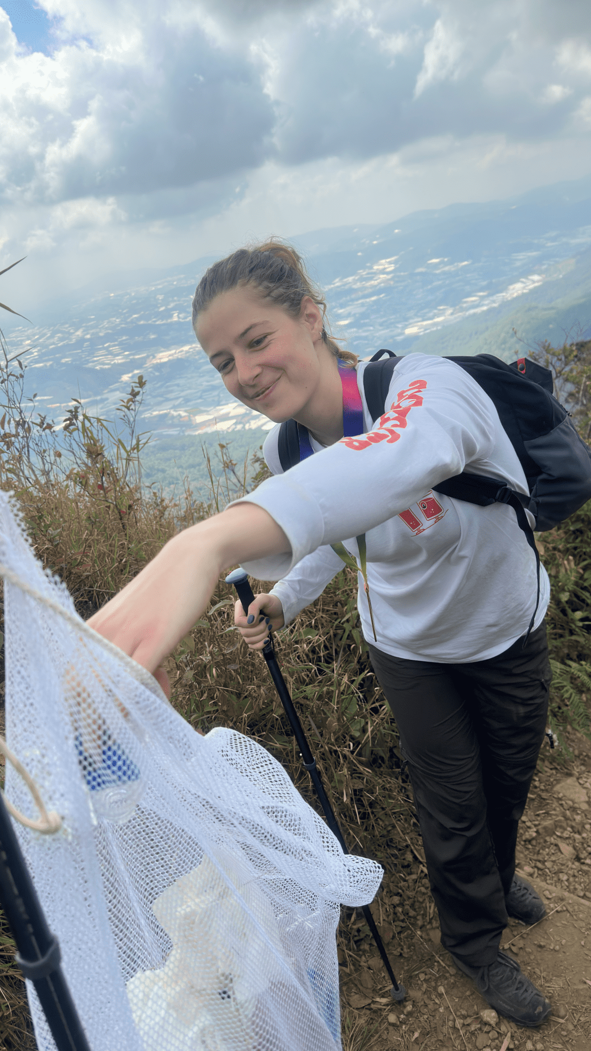 Collecting trash and carrying it down the mountain